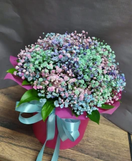 Композиция из разноцветных гипсофил, представленная в шляпной коробке, словно воплощение радуги на земле. Яркие и сочные оттенки цветов создают ошеломляющий эффект, наполняя пространство вокруг взрывом красок и радости. Каждая гипсофила в этой композиции как отдельная живая картина, переливающаяся разнообразием цветов и оттенков. Шляпная коробка, украшенная изящной лентой, придает композиции особый шарм и элегантность, делая ее настоящим произведением искусства. Эта яркая композиция словно напоминает о том, что жизнь – это праздник, который стоит отмечать каждый день.